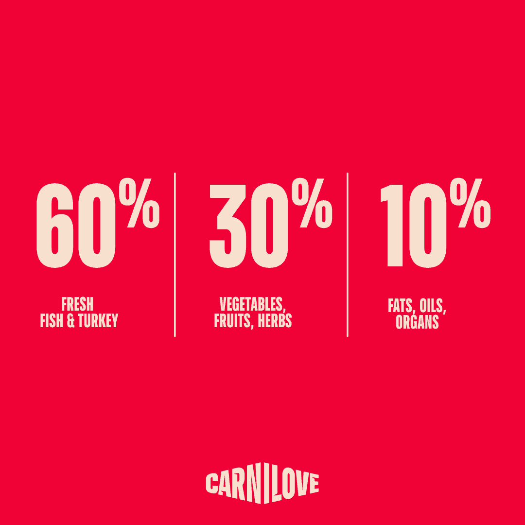 Samenstelling: verse vis (34 %), verse kalkoen (26 %), gele erwten, erwteneiwit, rundvet (5 %), gehydrolyseerde lever (3 %), kikkererwten (3 %), pompoen (3 %), rode linzen, gedroogde appelpulp (2,2 %), zalmolie (2 %), lijnzaad, eierschalen, wortel, kaliumchloride, erwtenmeel, gedroogde duindoorn (0,2 %), gedroogde gemberwortel (0,1 %), gedroogde bosbessen (0,1%), gedroogde rozemarijn (0,1%), gedroogde veenbessen (0,1 %), gedroogde tijm (0,1 %), gehydrolyseerde schalen van schaaldieren (bron van glucosamine, 0,022 %), cichoreiwortel (bron van fructo-oligosacchariden, 0,0163 %), kraakbeen extract (bron van chondroïtine, 0,014 %), biergist (bron van mannan-oligosacchariden, 0,013 %), yucca schidigera (0,085 %).