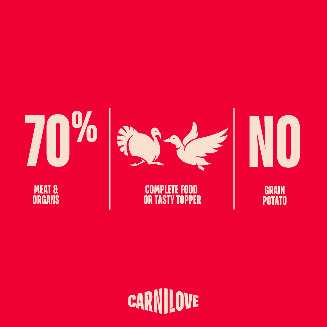Samenstelling: kalkoen 44 %, eend 26 %, bouillon, timotheegras 4 %, erwtenmeel, lijnzaadolie, erwtenvezels.