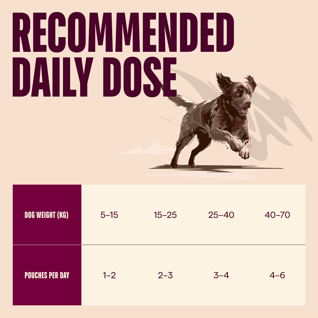 Voedingsadvies: Volg onderstaand voedingsadvies bij het geven als compleet voer of verlaag de dagelijkse portie en combineer het met brokjes. De dagelijkse hoeveelheid hangt bijvoorbeeld af van grootte, leeftijd en activiteit van de hond. . Zorg ervoor dat uw hond altijd voldoende vers drinkwater ter beschikking heeft. Te gebruiken tot, partijnummer en registratienummer staan op de achterkant van de verpakking. Het product kan ongeopend op kamertemperatuur worden bewaard, vermijd direct zonlicht. Op een droge en koele plaats bewaren. Na openen in de koelkast bewaren en binnen 3 dagen opmaken.