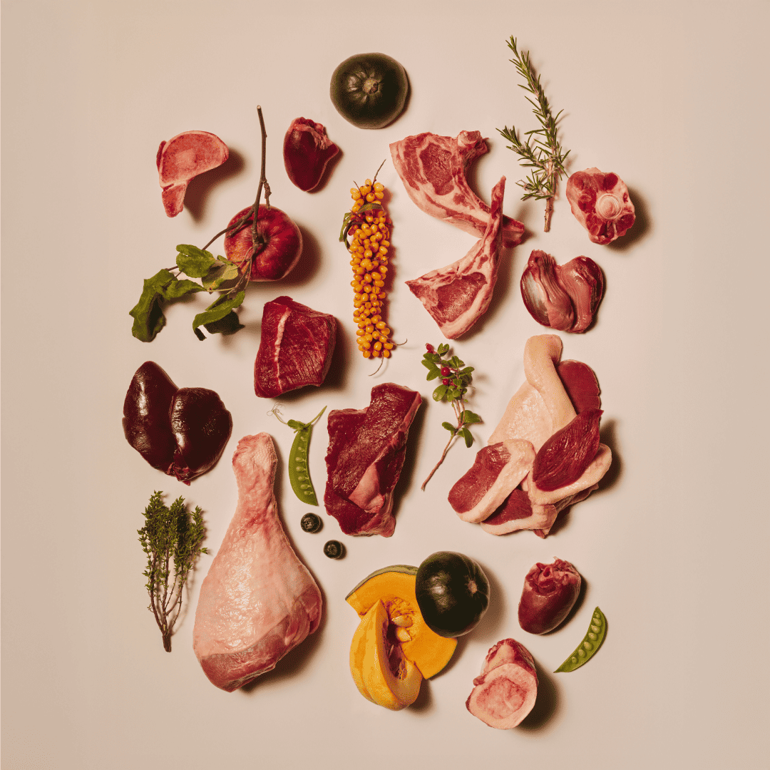 Samenstelling: wild zwijn 50Â % (wild zwijneiwit 35Â %, gehydrolyseerd wild zwijneiwit 15Â %), pompoen (15Â %), gele erwten (8Â %), gedroogde appelpulp (5Â %), wortel (5Â %), kikkererwten (4Â %), gedroogde rozenbottels (4Â %), kippenvet (4Â %), lijnzaad (2Â %), gedroogde spinazie (2Â %), lijnzaadolie (1Â %).