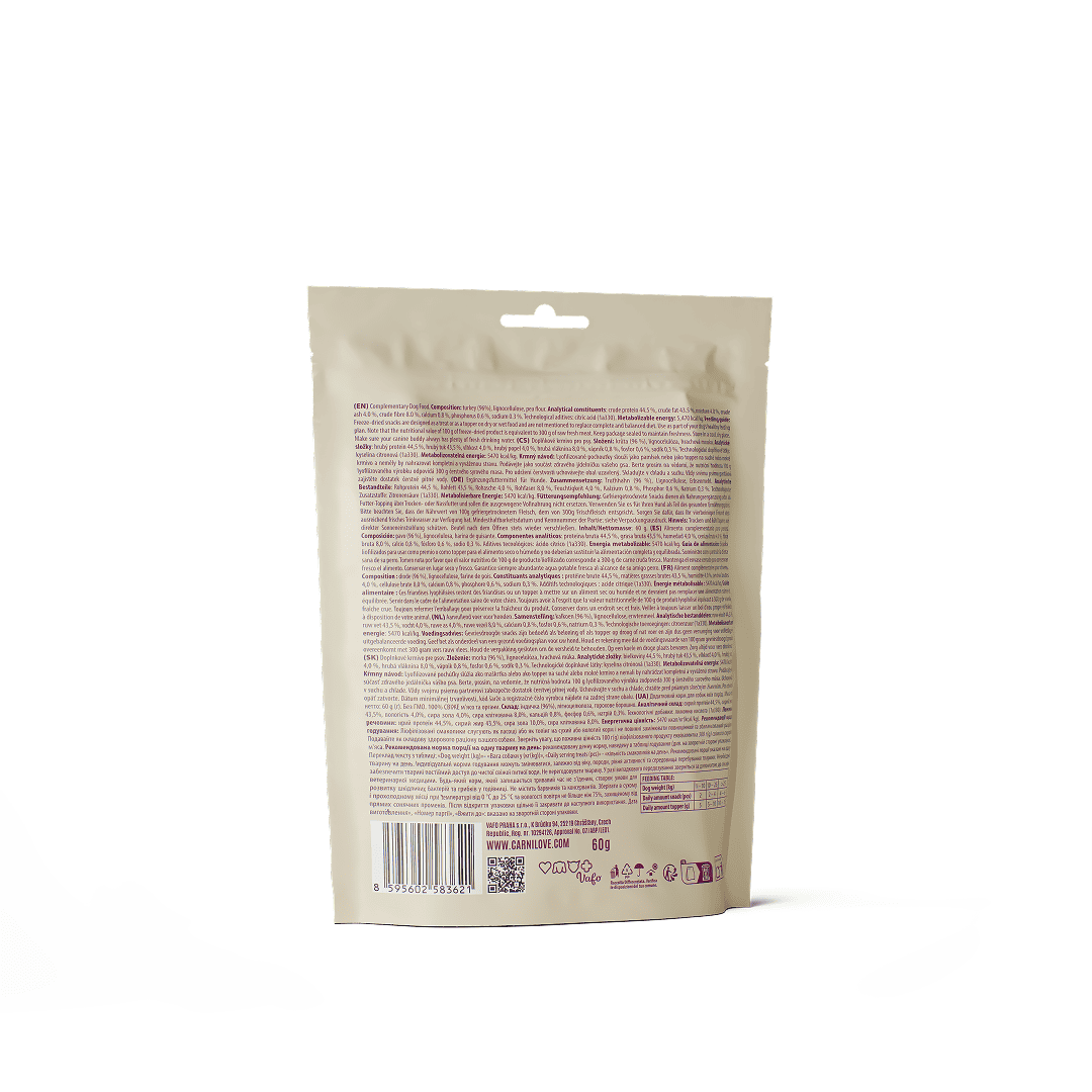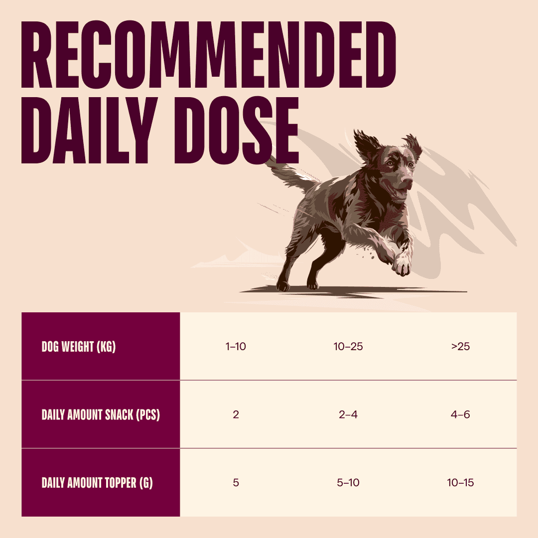 Voedingsadvies: Gevriesdroogde snacks zijn bedoeld als traktatie of als toevoeging op droog- of natvoer en zijn niet bedoeld als vervanging van een complete en uitgebalanceerde voeding. Gebruik ze als onderdeel van een gezond voedingspatroon voor uw hond. Houd er rekening mee dat de voedingswaarde van 100 g gevriesdroogde producten gelijk is aan 300 g vers rauw vlees. Zoals bij alle voedingsmiddelen, moet u voorzichtig zijn bij het bewaren en hanteren ervan. Was uw handen en voerbakken voor en na het serveren. Houd de verpakking gesloten om de versheid te behouden. Bewaar op een koele, droge plaats. Zorg ervoor dat uw hond altijd voldoende vers drinkwater heeft.