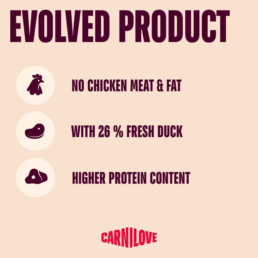 Samenstelling: verse eend (26 %), eendeneiwit (20 %), gehydrolyseerd fazanteiwit (14 %), gele erwten, rundvet (6 %), gehydrolyseerd kalkoeneiwit (4 %), gehydrolyseerde lever (4 %), kikkererwten, lignocellulose, erwteneiwit, natriumchloride, kaliumchloride, pompoen, lijnzaad, zalmolie (1 %), erwtenmeel, wortel, gedroogde duindoorn (0,1 %), gedroogde gemberwortel (0,05 %), gedroogde bosbessen (0,05 %), gedroogde rozemarijn (0,05 %), gedroogde veenbessen (0,05 %), gedroogde tijm (0,05 %), biergist (bron van mannan-oligosacchariden, 0,0134 %), cichoreiwortel (bron van fructo-oligosacchariden, 0,0108 %), yucca schidigera (0,0072 %).