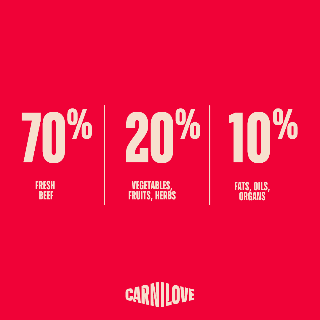 Samenstelling: vers rundvlees (70 %), gele erwten, rundvet (6 %), gehydrolyseerde lever (3 %), erwteneiwit, lijnzaad, wei, zalmolie (1 %), eierschalen, kikkererwten (1 %), pompoen (1 %), rode linzen, kaliumchloride, erwtenmeel, gedroogde duindoorn (0,2 %), gedroogde gemberwortel (0,1 %), gedroogde bosbessen (0,1 %), gedroogde rozemarijn (0,1 %), gedroogde veenbessen (0,1 %), gedroogde tijm (0,1 %), gehydrolyseerde schalen van schaaldieren (bron van glucosamine, 0,022 %), cichoreiwortel (bron van fructo-oligosacchariden, 0,0163 %), kraakbeen extract (bron van chondroïtine, 0,014 %), biergist (bron van mannan-oligosacchariden, 0,013 %), yucca schidigera (0,085 %).