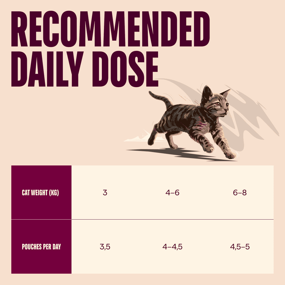 Voedingsadvies: Op kamertemperatuur serveren voor de beste smaak. Zorg ervoor dat uw kat altijd voldoende vers water te drinken heeft. Geopende verpakking kan worden ingevroren of in de koelkast worden bewaard en moet dan binnen 3 dagen worden geconsumeerd. Op een droge en koele plaats bewaren, vermijd direct zonlicht. De houdbaarheidsdatum is 24 maanden vanaf de productiedatum; zie verpakking voor partijnummer.