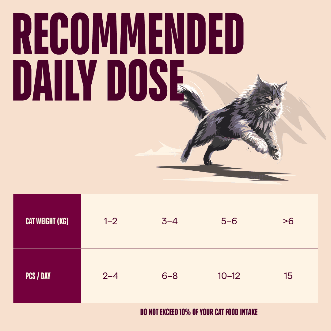 Voedingsadvies: Geef ongeveer 2 stuks per 1 kg lichaamsgewicht van uw kat, maar niet meer dan 10% van de totale dagelijkse voeding. Als de snacks te groot zijn voor uw kat, kunt u ze voor het serveren eenvoudig fijnmaken. Gevriesdroogde rauwe snacks zijn aanvullend voer en zijn niet bedoeld ter vervanging van een complete en uitgebalanceerde voeding. Zorg ervoor dat uw kat altijd voldoende vers drinkwater heeft. Bewaar op een koele, droge plaats, uit de buurt van direct zonlicht. Ten minste houdbaar tot de datum op de verpakking. Na opening opnieuw afsluiten.