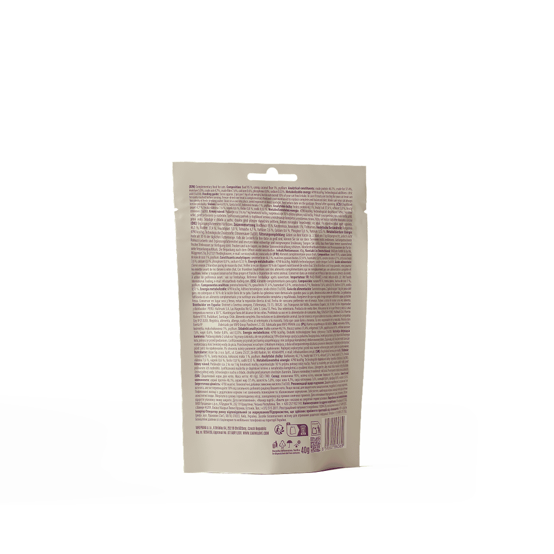 Samenstelling: rundvlees 95 %, kattenkruid, kokosmeel 1 %, psyllium.