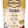 Samenstelling: 40% gedroogde kip, gele erwten, vloeibaar plantaardig zetmeel, kippensaus, saus van pluimveelever, collageen, 1% tijm, zalmolie.